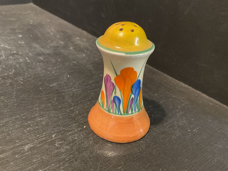 CLARICE CLIFF, AUTUMN CROCUS, a lovely little MUFFINEER shape peppered pot, bold and brightly decorated.