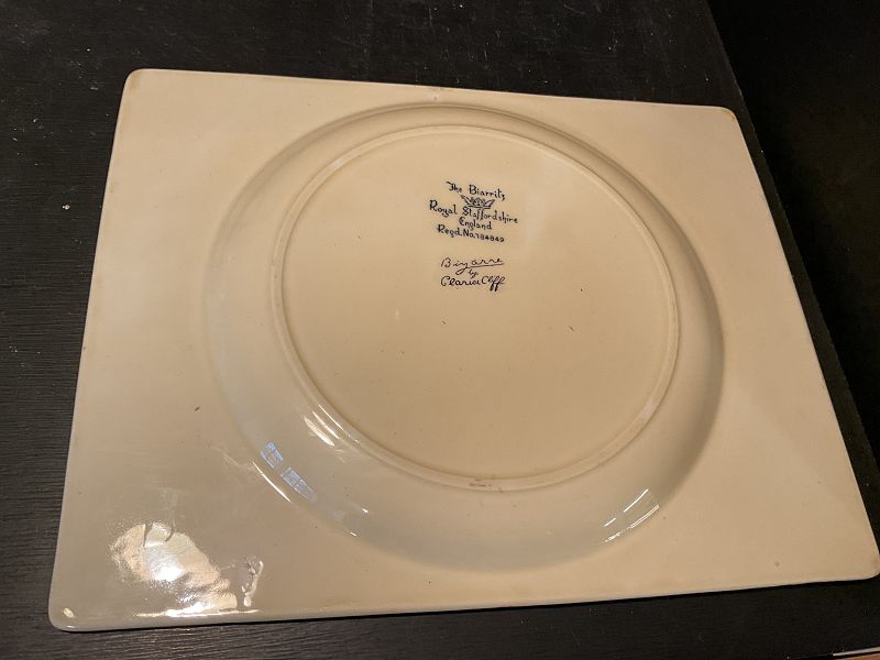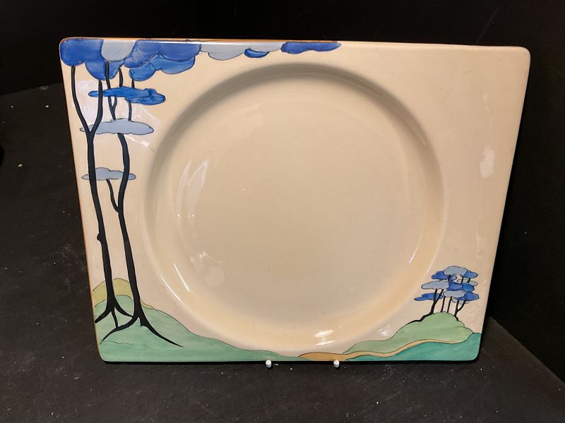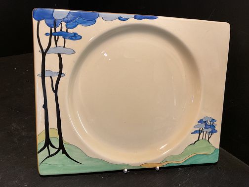 CLARICE CLIFF, “ BLUE FIRS”, a fabulous example of this highly desirable landscape design, a stunning and large Biarritz shape plate measuring just over 10.25” x 8”.
