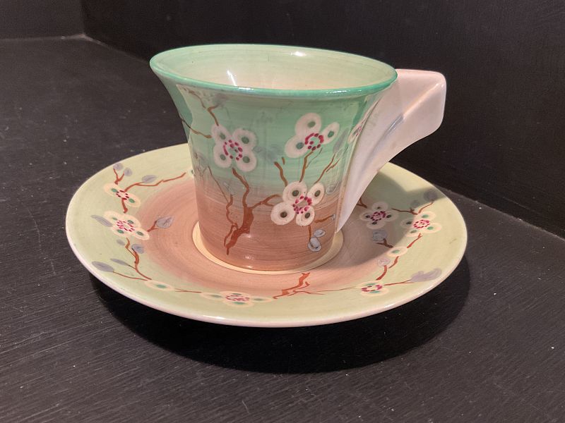 CLARICE CLIFF, MAY BLOSSOM, a super little daffodil shape coffee cup and saucer in excellent condition with no chip, cracks or repairs.