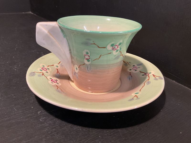 CLARICE CLIFF, MAY BLOSSOM, a super little daffodil shape coffee cup and saucer in excellent condition with no chip, cracks or repairs.