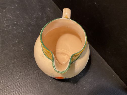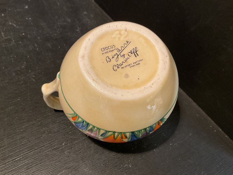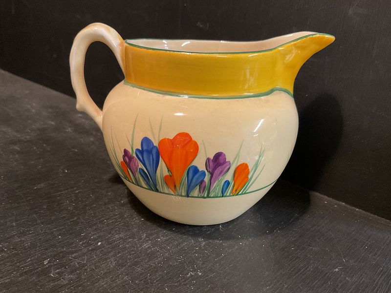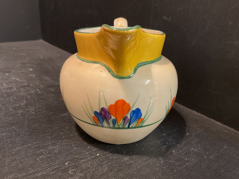 CLARICE CLIFF, another rarity here, a super 3.75” PERTH shape jug with no bottom banding….a match to the wonderful bowl just listed and also a rare triple image too.
