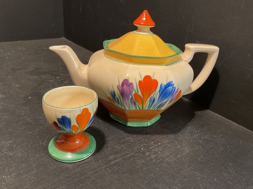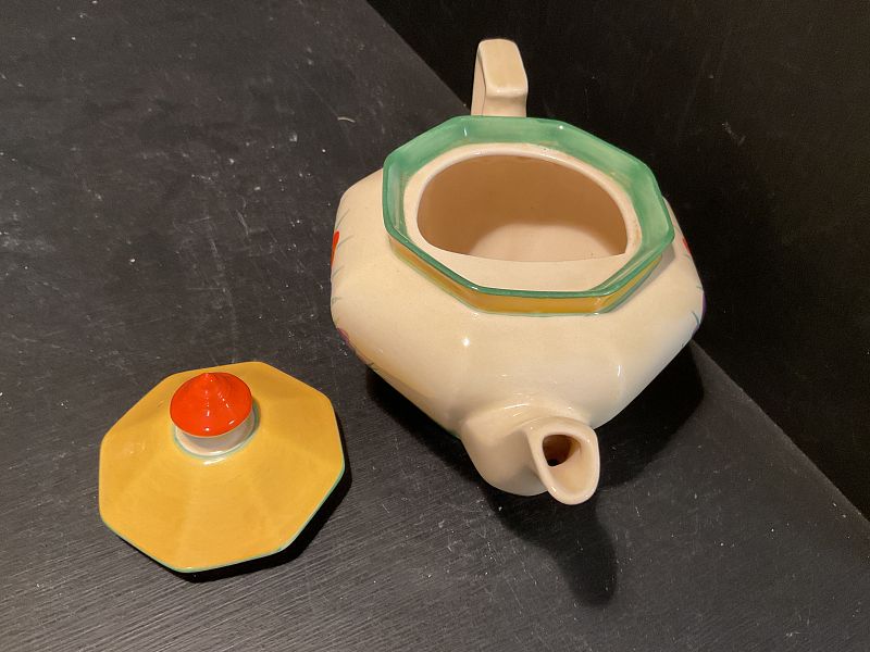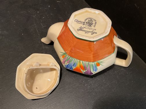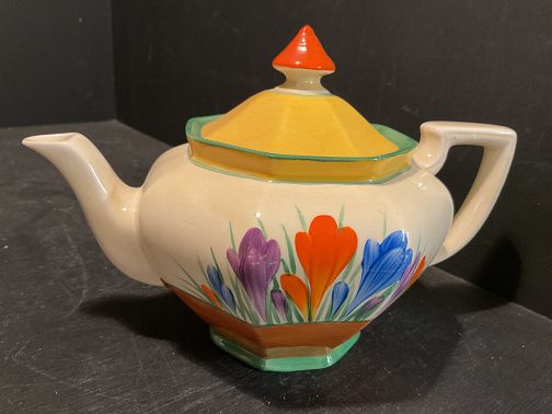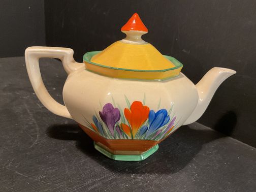CLARICE CLIFF, a wonderful and RARE Autumn Crocus Athens shape teapot, just 5” at its tallest and 8” from handle to the tip of the spout.