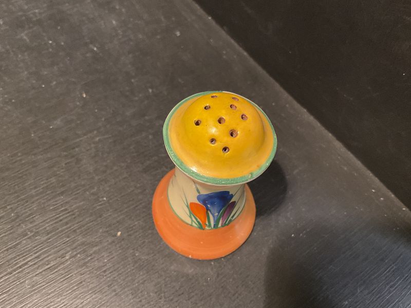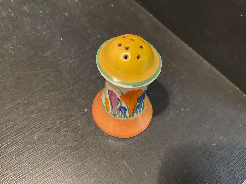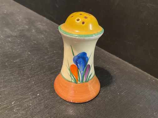 CLARICE CLIFF, AUTUMN CROCUS, a lovely little MUFFINEER shape peppered pot, bold and brightly decorated.