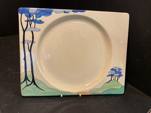 CLARICE CLIFF, “ BLUE FIRS”, a fabulous example of this highly desirable landscape design, a stunning and large Biarritz shape plate measuring just over 10.25” x 8”.