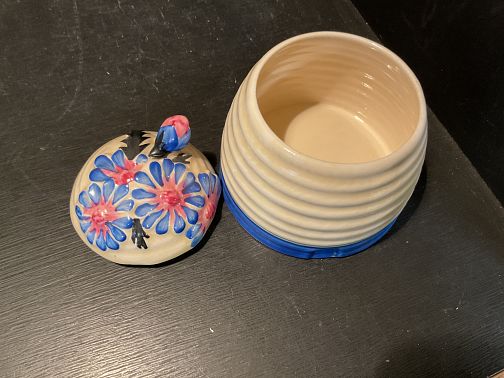 Boldly and brightly decorated, the lid is simply stunning in colour and contrast.