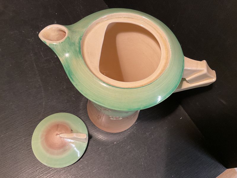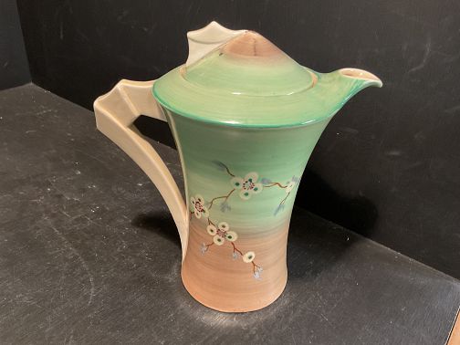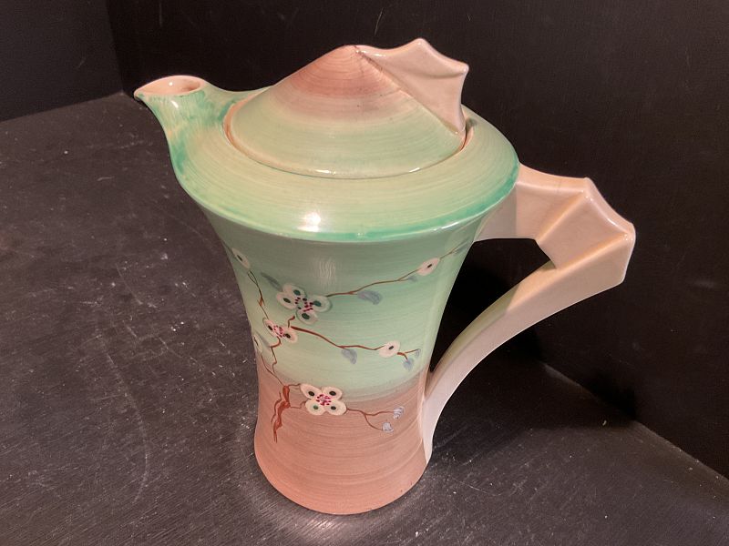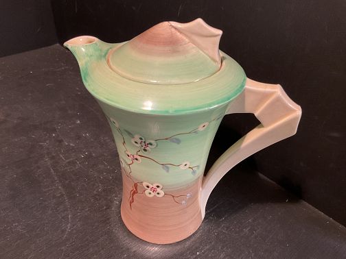 CLARICE CLIFF, “ MAY BLOSSOM”, a lovely ‘daffodil’ shape coffee pot and cover in the subtle and pastel green colourway.