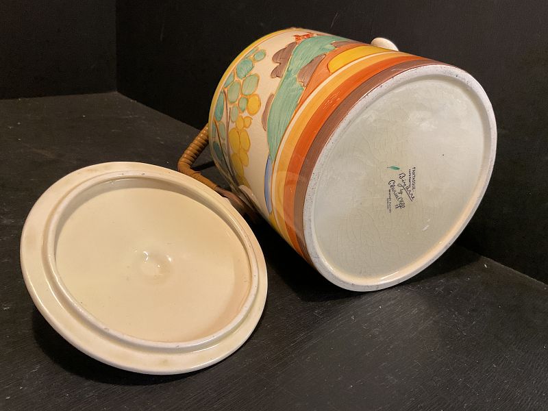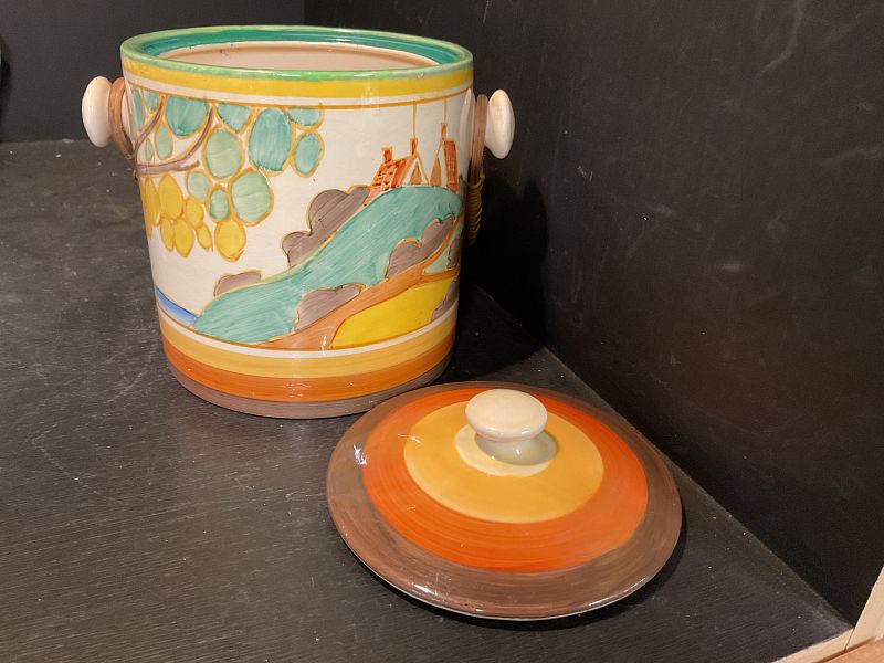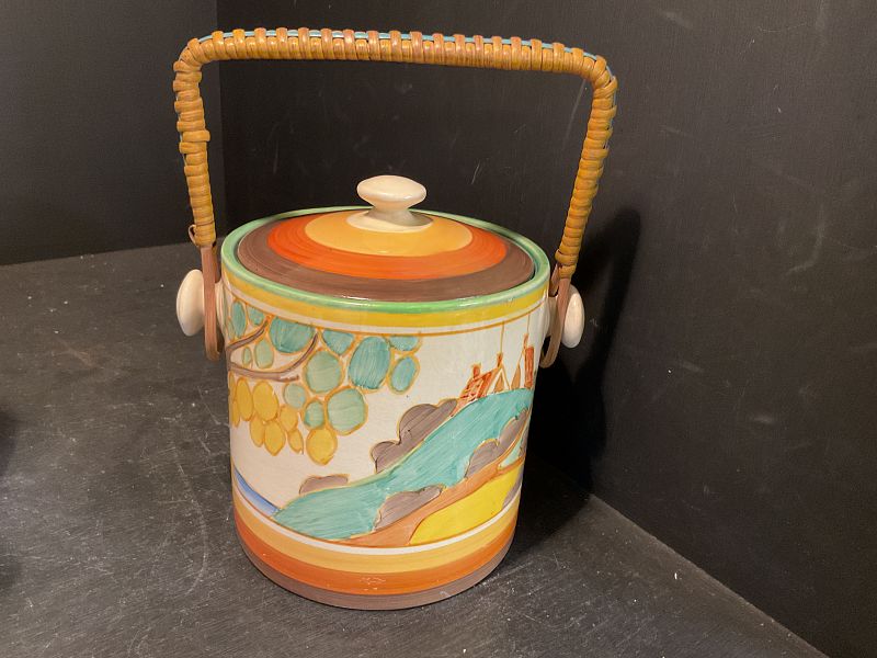 CLARICE CLIFF, SECRETS, a lovely ‘double image’ HEREFORD shape biscuit barrel in this ever popular landscape design but note the rare banding to the base of the barrel and the matching banding to the lid.